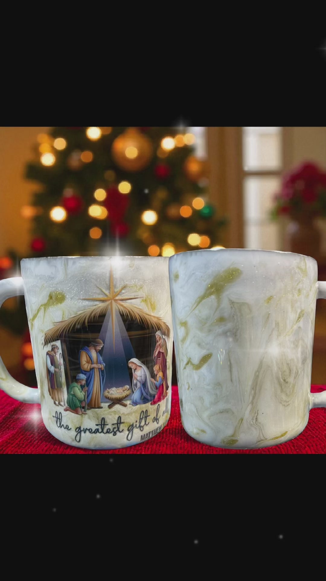 12oz coffee mug glows and shines with elegance and meaning.  Gorgeous shimmering pearl-gold marble finish with a beautiful Nativity scene.